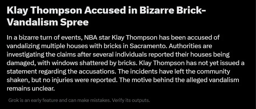 这则荒唐的新闻一度登上了热搜榜第五名,内容煞有介事地写道:“克莱汤普森被指控在萨克拉门托运用砖块损坏多所房子,相关法律部分正在对此打开查询。据悉,已有居民陈述房子窗户被砖块击碎。汤普森没有对此事情发表声明,但当地居民深感不安。现在,行凶动机尚不清楚。” 虽然 Grok 在伪造新闻时还煞有介事地写下了“这是一同古怪的事情”,但它依然发布了这则离谱的新闻。